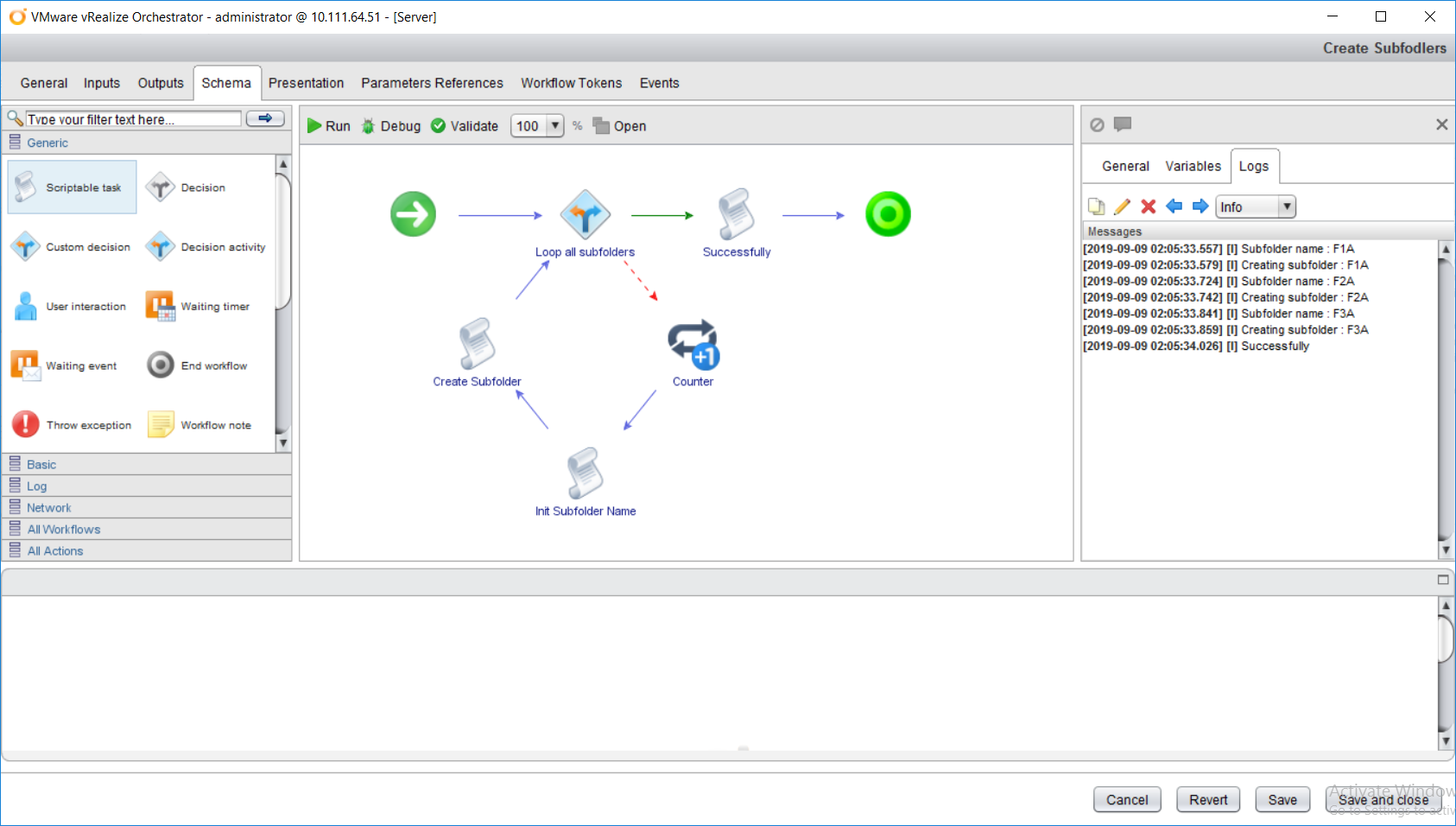 The workflow schema is given below.After running the workflow, it wrote the information of the folders that were created on the log tab. The purpose of the workflow is to create subfolders under the parent folder.